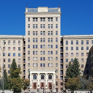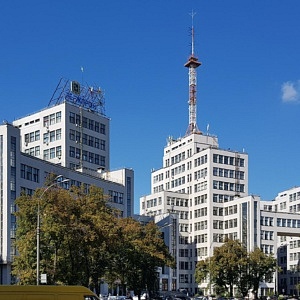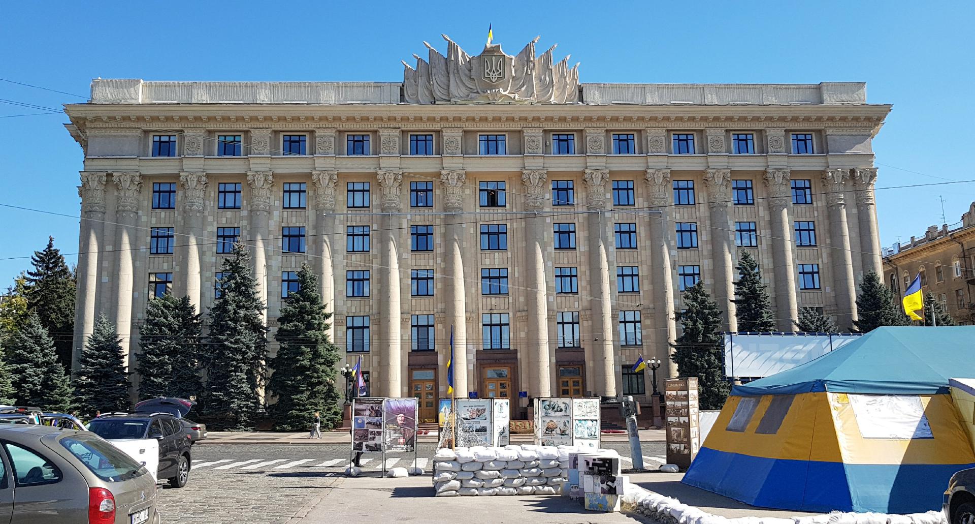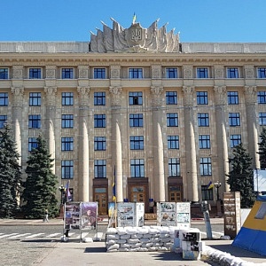 Unsere erste Station in der Stadtmitte war der Freiheitsplatz (Майдан Свободи). Der in den 1920er Jahren gestaltete Platz ist etwa 750 m lang, bis zu 125 m breit und hat eine Fläche von etwa 11,5 ha. Er zählt somit zu den größten Stadtplätzen Europas. Im Nordwesten ist der Platz kreisförmig mit einem Park in der Mitte gestaltet, während er an der südöstlichen Seite eine rechtwinklige, unbebaute Fläche hat. Am Übergang vom runden zum rechtwinkligen Teil des Platzes befand ein 1963 eingeweihtes, 20 m hohes Lenindenkmal. Es wurde im September 2014 von pro-ukrainischen Demonstranten gestürzt, aktuell werden die Reste des Sockels beseitigt. Am Platz befindet sich unter anderem das Hauptgebäude der Wassyl-Karasin-Universität Charkiw und das Derschprom-Gebäude (Держпром), ein 1928 vollendeter, erster sowjetischer 13-stöckiger „Wolkenkratzer“ im Stil des Konstruktivismus. Weitere Gebäude auf dem Platz wurden im Stil des Sozialistischen Klassizismus erbaut.