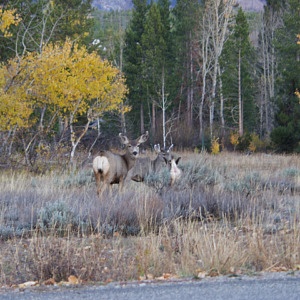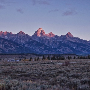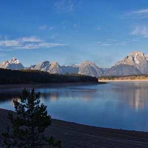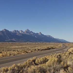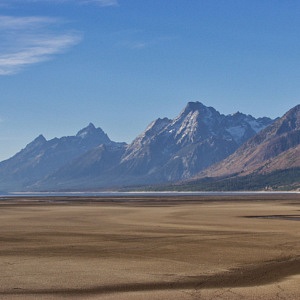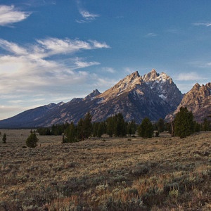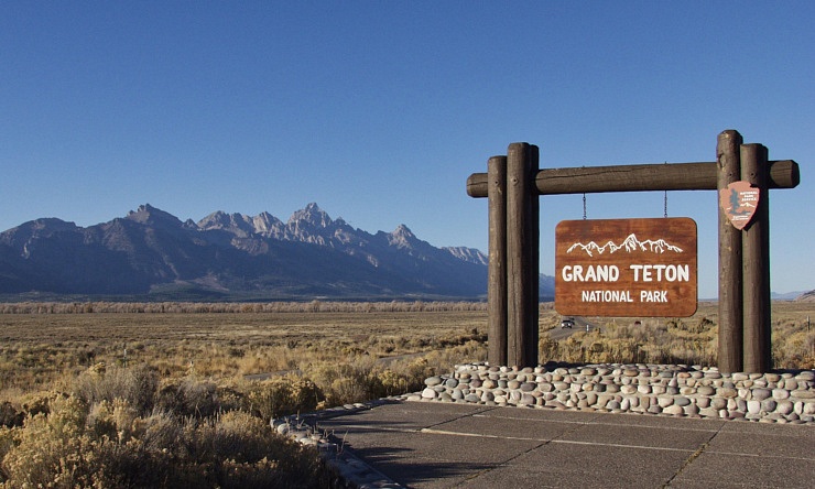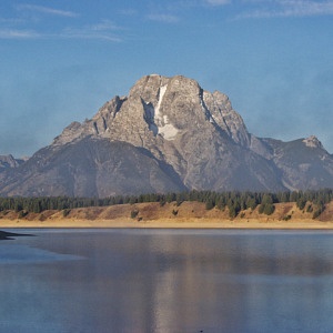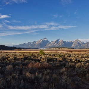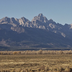 Besuch im Grand Teton Nationalpark im Oktober 2003. Das 1929 zum Nationalpark erhobene Schutzgebiet hat seinen Namen von der Teton-Kette, ein in Nord-Süd-Richtung verlaufender Gebirgszug, der sich ohne Vorgebirge zweitausend Meter aus der weiten Talebene des Jackson Hole erhebt. Der höchste Gipfel, der Grand Teton, hat eine Höhe von 4.199 Meter. Die Herkunft des Namens der Gebirgskette wird französischen Trappern zugeschrieben, die den Snake River auf einer Expedition der North West Company im frühen 19. Jahrhundert erkundeten und die Berge nach ihrer Form als les trois tétons („drei Brüste“) bezeichneten.