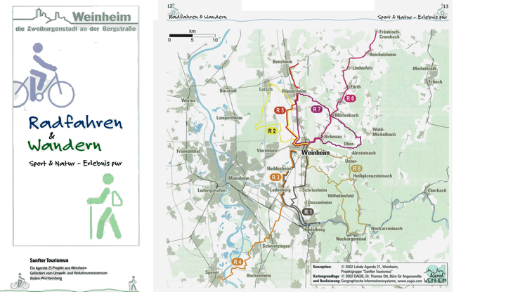 Rad- und Wanderwegekarten für drei von der Lokalen Agenda 21 konzipierten Broschüren zum Sanften Tourismus in Weinheim an der Bergstraße.