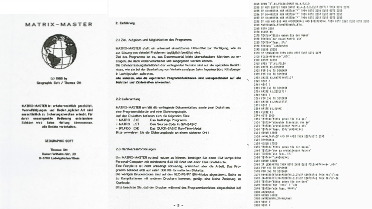 Das Softwarepaket MatrixMaster erzeugt und berechnet übersichtliche Matrizen zur Auswertung von Verkehrszählungen (Quelle-Ziel-Beziehungen). Dabei werden Herkunftsort und Ziel von Verkehrsteilnehmern erfasst und quantitativ ausgewertet. Die Programmierung erfolgte unter Microsoft QuickBASIC 2.0 unter MS-DOS 4.01.