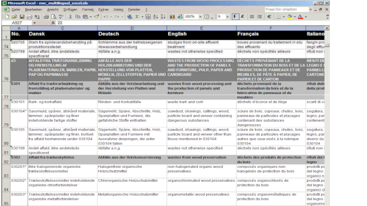 Der „IUWA Multilingualer Abfallkatalog“ enthält das komplette Europäische Abfallverzeichnis in den Amtssprachen der EU (Dänisch, Deutsch, Englisch, Finnisch, Französisch, Italienisch, Niederländisch, Portugiesisch, Schwedisch, Spanisch), alle mehr als 900 Abfallstoffbezeichnungen in einer übersichtlichen Tabelle.