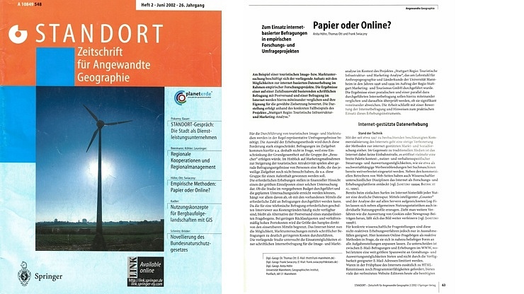 HÖHN, Anita / OTT, Thomas / SWIACZNY, Frank (2002): Papier oder Online? Zum Einsatz Internet-basierter Befragungen in empirischen Forschungs- und Umfrageprojekten. Standort 26 (2), 63-69