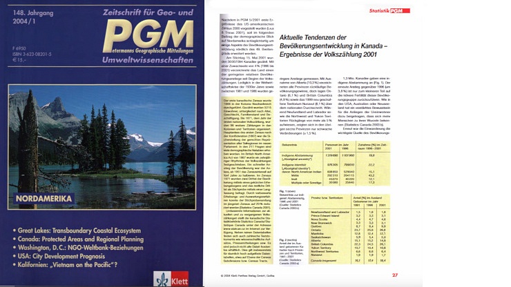 OTT, Thomas (2004): Aktuelle Tendenzen der Bevölkerungsentwicklung in Kanada – Ergebnisse der Volkszählung 2001. Petermanns Geographische Mitteilungen 148 (1), 27-29